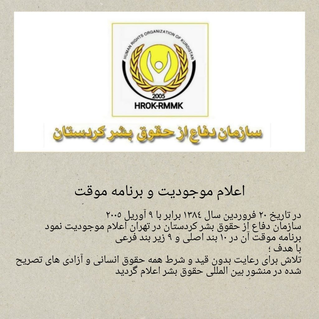 بند ٧ . از آغاز تاسیس سازمان دفاع از حقوق بشر کردستان تا زمان تشکیل مجمع عمومی این برنامه موقت به صورت آزمایشی اجرا می شود و سپس در مجمع عمومی سازمان با مشارکت مستقیم کلیه اعضا، برنامه و اساسنامه اصلی تدوین و تصویب خواهد شد.