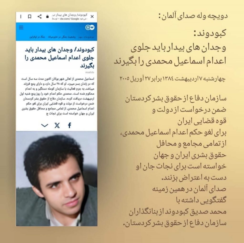 سازمان دفاع از حقوق بشر كردستان ضمن درخواست از دولت و قوه قضايى ايران براى لغو حكم اعدام اسماعيل محمدى، از تمامى مجامع و محافل حقوق بشرى ايران و جهان خواسته است براى نجات جان او دست به اعتراض بزنند. صداى آلمان در همين زمينه گفتگويى داشته با محمد صديق كبودوند از بنانگذاران سازمان دفاع از حقوق بشر كردستان.