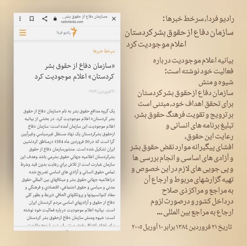 يک گروه مدافع حقوق بشر به نام «سازمان دفاع از حقوق بشر کردستان» اعلام موجوديت کرد. در بخشی از بيانيه اعلام موجوديت اين سازمان آمده است: سازمان دفاع از حقوق بشر کردستان يک نهاد مستقل غير سياسی و غيرآيين گرا است که در ٢٠ فروردين ماه ١٣٨٤ در مناطق کردنشين ايران تشکيل شده است. منشور سازمان دفاع از حقوق بشر کردستان اعلاميه جهانی حقوق بشر می باشد و هدف اين سازمان عبارت است از تلاش برای رعايت بدون قيد و شرط تمامی حقوق انسانی و آزادی های اساسی تصريح شده دراعلاميه جهانی حقوق بشر و ميثاقهای بين المللی حقوق مدنی و سياسی و حقوق اجتماعی، اقتصادی و فرهنگی و مفاد کنوانسيونها و پروتکلهای الحاقی ذيربط و بطور کلی دفاع از حقوق و آزادی های اساسی مردم کردستان ايران است. بيانيه اعلام موجوديت در باره فعاليت خود نوشته است: شيوه و منش سازمان دفاع ازحقوق بشر کردستان برای تحقق اهداف خود، مبتنی است بر ترويج و تقويت فرهنگ حقوق بشر، تبليغ برنامه های انسانی و رعايت اين حقوق، افشای پيگيرانه موارد نقض حقوق بشر و آزادی های اساسی و انجام بررسی ها و پی جويی های لازم در اين خصوص و تهيه گزارشهای مربوط و ارجاع آن به مراجع و مراکز ذی صلاح درداخل کشور و درصورت لزوم ارجاع به مراجع بين المللی و نيز همکاری با نهاد ها و مراجع و محافل مدافع حقوق بشری در ايران و منطقه و جهان. کليه فعاليتهای اين سازمان کاملا علنی خواهد بود
